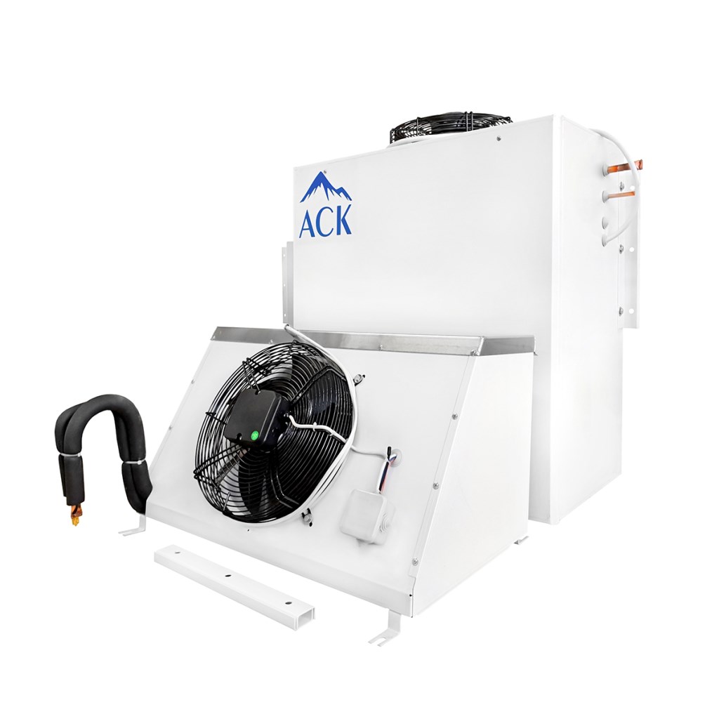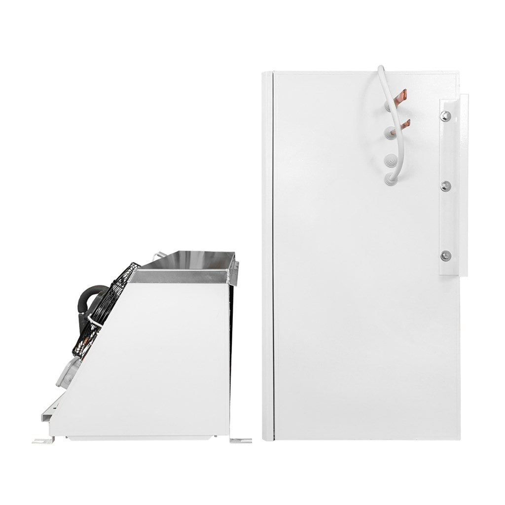 Низкотемпературная сплит-система АСК-Холод ССп-31 предназначена для поддержания необходимого температурного режима в холодильных камерах на предприятиях пищевой промышленности, общественного питания и торговли. Модель оснащена компрессорно-конденсаторным блоком и воздухоохладителем, соединенными между собой теплоизолированными медными трубками, по которым циркулирует хладагент и выводится конденсат, а также кабелем питания и управления. Корпус изготовлен из оцинкованной стали белого цвета толщиной 0,9-1,2 мм с полимерным покрытием в защитной пленке, трубы конденсатора и испарителя - из меди, ребра - из алюминиевого сплава.